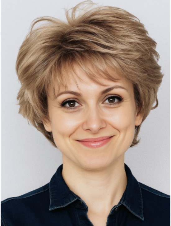 This stylish wig features a layered, relaxed design with tousled finger waves that transition smoothly down to the nape.